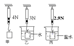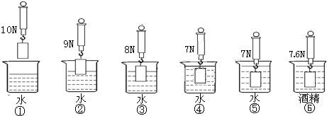 小刚所在组的同学选用了一个弹簧测力计、一个金属块、两个相同的烧杯(分别装有一定量的水和酒精),对浸在液体中的物体所受的浮力进行了探究。下图表示探究过程及有关数据。