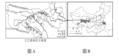 图B阴影地区甲为我国的三 江源地区,是我国重要的水源涵养地。长江总水量的25%、黄河总水量的49%、澜沧江总水量的15%均来自这里,被誉为“中华水塔”。但近年来,由于过度放牧、乱采滥挖等不合理的人类活动,使该地区出现了水土流失加剧、草地沙化严重等问题,对当地及河流中下游地区产生重要影响。