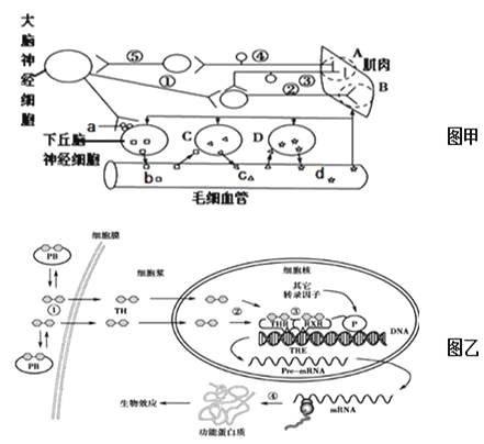 说明:图乙中①为甲图中的物质d;P为RNA 聚合酶;PB为图甲中d物质的运输蛋白