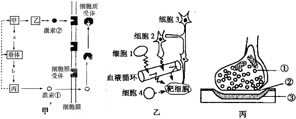图甲所示的调节过程是人体稳态的重要组成部分,图乙为细胞间信息传递的几种模式示意图,图丙是图乙局部结构的放大图。甲~丙表示器官,a、b表示激素或大分子物质。请回答下列问题: