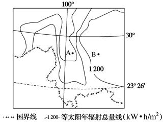 若图中等值线等差值为300,则图中B两地太阳年辐射总量差值最可能是