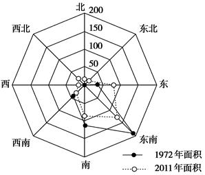 海平面减速上升下图示意1972~2011年我国西北地区某流域不同朝向冰川的变化(单位:km2)。读图,完成以下小题。