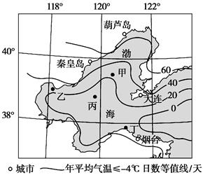 海冰含盐量接近淡水,适当处理后可作为淡水资源。下图示意渤海及附近区域年平均气温≤-4℃日数的分布。读图,完成以下小题。