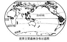 读世界主要森林分布示意图,据此回答以下小题