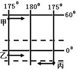 甲、乙、丙三艘轮船从所在海域同时沿图示方向驶向180°经线,若时速相同,则( )