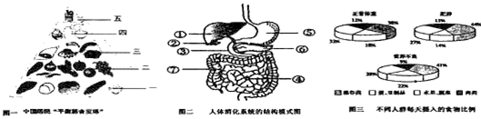 图三所示,每天摄入的营养成分的比例不当,会导致肥胖或营养不良。其中肥胖人群摄入的_________和_________(填图三中图例所示的食物种类名称)的量较正常人偏多。营养不良会影响健康,如缺铁易患贫血,因为铁是红细胞中_________的重要组成成分。