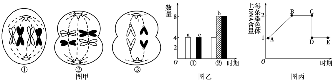 (2) 如果细胞完成了图乙中①→②的过程,则该过程相当于图丙中_____段的变化(用字母表示),图乙A 、b 、c 中表示核DNA 的是_____。
