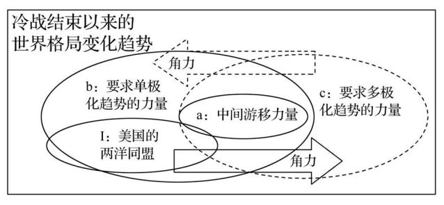 下图是学者绘制的“当代世界格局的转型”模式图。据图可知,该学者认为 ( )